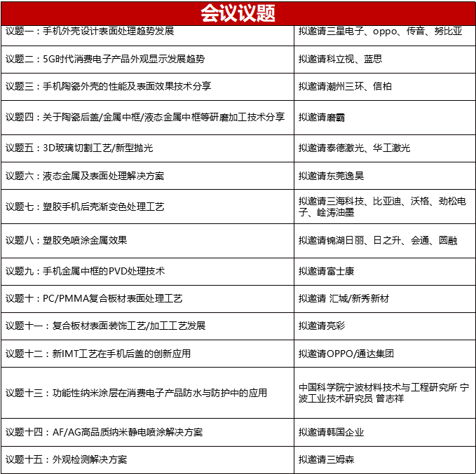 2018年,手机、家电产品、智能穿戴产品的材质选择及表面处理工艺正在发生变化,尤其在手机行业,玻璃、陶瓷、复合材料凭借其外观及良好性能优势,出现了慢慢的代替金属的趋势,手机中框未来采用不锈钢、液态金属趋势越明显,随之而来的表面处理工艺趋势变革及产业配套也在迅猛发展。东莞作为消费电子的加工重地,有着举足轻重的地位,寻材问料®借着2018消费电子表面趋势高峰论坛,为行业内人士提供一个交流平台,期待业内人士参与,我们相约东莞!