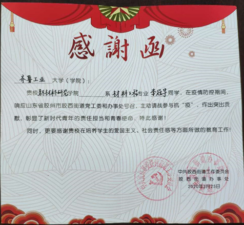 近日,新材料所收到了一封来自胶州市胶西街道的感谢函,我所2018级李冠宇同学,因在街道疫情防控志愿服务工作中表现突出,受到中共胶州市委胶西街道工作委员会、胶州市胶西街道办事处的充分肯定,并对我校立德树人工作表示感谢。