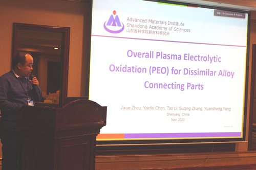 会上,周吉学副所长做了题为《Overall PEO surface treatment on dissimilar metal connecting parts》的报告,报告主要介绍了镁铝等异质金属材料构件整体微弧氧化技术,分析了氧化膜层的生长机制,分享了山东省科学院新材料研究所在镁合金微弧氧化表面防护处理领域研究成果。程开明博士做了题为《In-situ experimental observation and kinetic numerical inversion of the diffusion growth of multiple intermetallic compounds in Mg-Al-Zn system》的报告,报告主要介绍了镁合金中金属间化合物扩散生长的原位观察实验,及扩散系数的高效数值反演计算,为镁合金高温抗蠕变性能的动力学机理研究提供了理论基础。