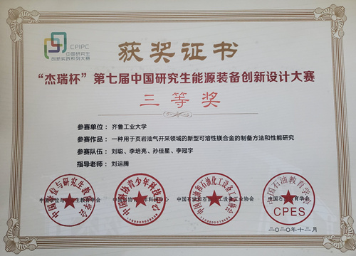 由中国学位与研究生教育学会、中国科协青少年科技中心主办,西安石油大学承办的“杰瑞杯”第七届中国研究生能源装备创新设计大赛于2020年12月4日至6日在西安石油大学雁塔校区决赛收官,我单位参赛项目“一种用于页岩油气开采领域的新型可溶性镁合金的制备方法和性能研究”喜获全国三等奖。