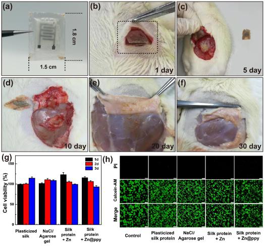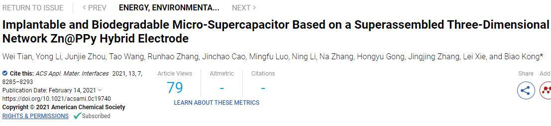一篇题为“Implantable and Biodegradable Micro-supercapacitor Based on a Superassembled Three-Dimensional Network Zn@PPy Hybrid Electrode”的最新研究论文发表在《ACS Applied Materials & Interfaces》(中科院一区TOP期刊),齐鲁工业大学(山东省科学院)新材料研究所为该工作的第一完成单位,2018级硕士研究生田伟和李勇博士为该论文的共同第一作者。该研究工作研发了一种基于超组装三维网状Zn@PPy复合电极材料,通过电化学沉积的方法将纳米级网状聚吡咯(PPy)组装在Zn微球上,该电极材料拥有较大的比表面积,表面富含活性位点,具有较高的比容量和优异的生物相容性,由Zn@PPy复合材料组装的瞬态超级电容器的最大能量密度和能量密度分别达到0.39 µWh/cm2和0.38 mW/cm2,通过小鼠体内植入和细胞毒性检测验证了其良好的生物相容性和可降解性,有望应用于植入式医疗器件、环境监测系统、数据安全等领域。