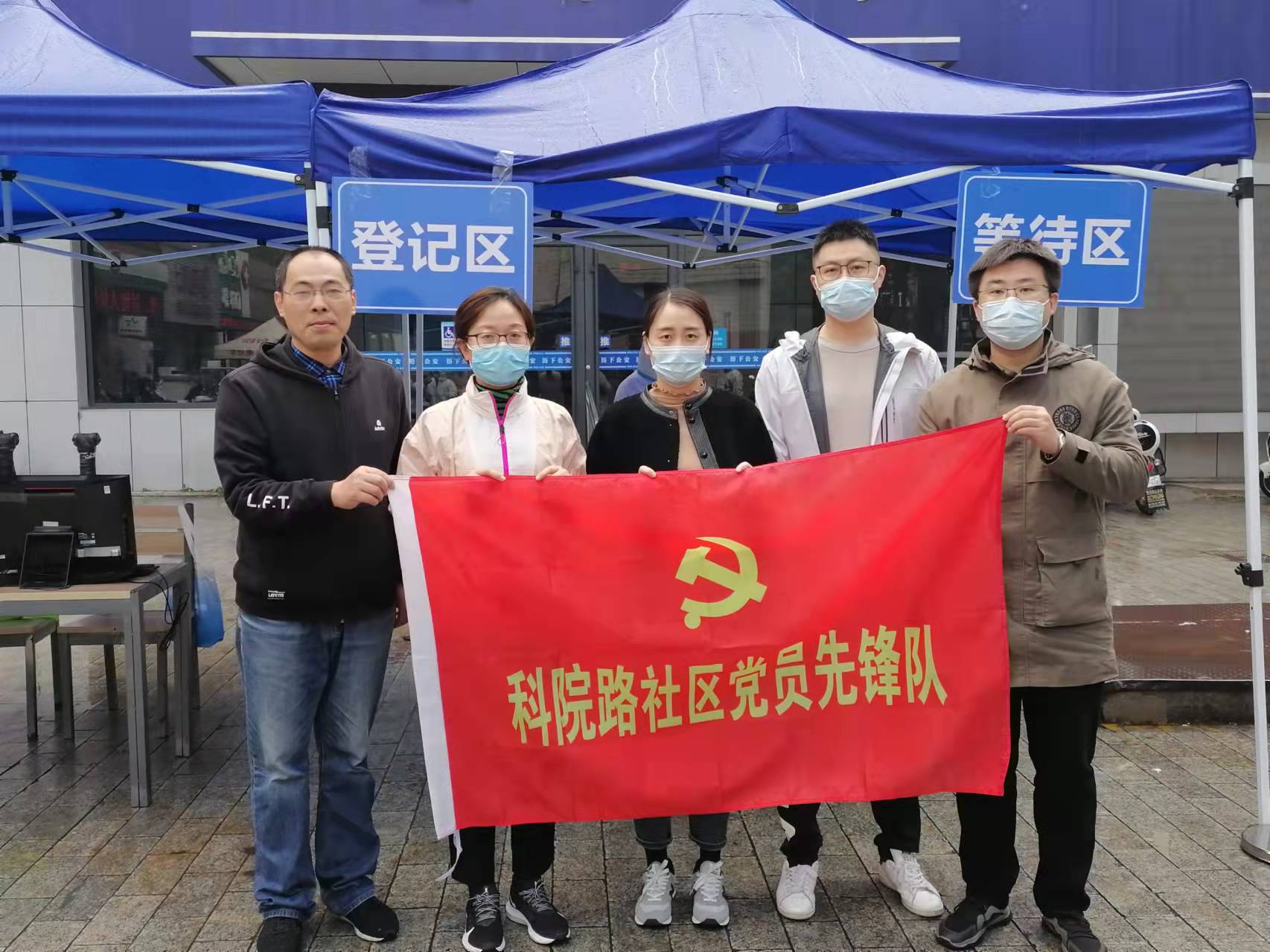 演练开始后,材料所、能源所党员先锋队员组成一队,迅速行动,带好应急物品赶到科院路6号内停车场,搭建采样点。早上10点前,采样点搭建完成,设置了入口、等候区、体温测量区、信息登记区、样本采集区、留观等候区、临时隔离区等区域。随后邀请路过群众参与扫码及录入信息等。