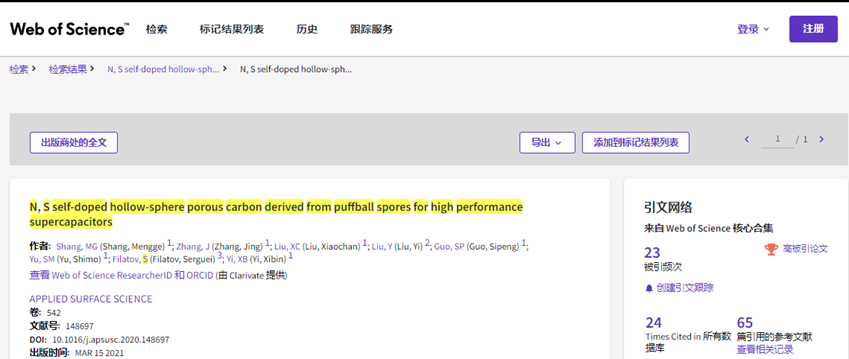 根据2022年1月13日公布的最新一期ESI统计数据,气凝胶超材料创新团队一篇论文成功入选高被引论文,该论文题为“N,S self-doped hollow-sphere porous carbon derived from puffball spores for high performance supercapacitors”,于2021年3月发表于一区top期刊《Applied Surface Science》 (IF=6.707)。第一作者为2019级研究生尚梦鸽,通讯作者为张晶副研究员,齐鲁工业大学(山东省科学院)新材料研究所为第一完成单位。