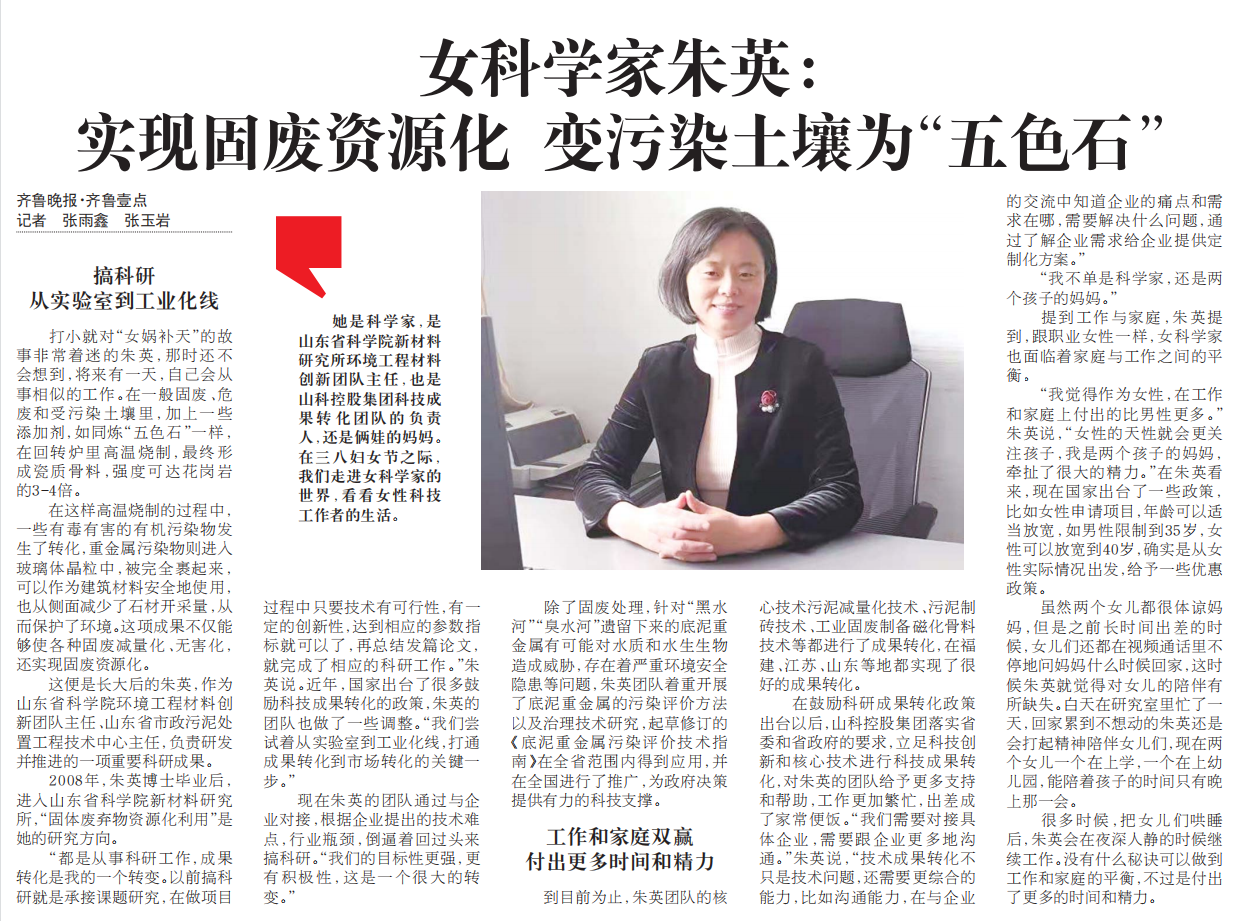 2022年3月9日刊印的《齐鲁晚报》以“实现固废资源化变污染土壤为‘五色石’”为题对我学部女研究员朱英博士进行了专题报道。
