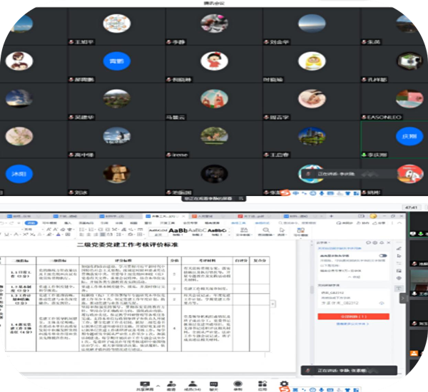 会上,与会人员集体通过云上祭奠英烈、缅怀寄托哀思,传承英烈们忠于使命、献身使命、不辱使命的崇高精神,不忘初心;李静同志带领大家学习校(院)党委印发的《二级党委党建工作考核评价办法(试行)》(齐鲁工大科院党字[2022]21号),对标考核评价办法,从基层党建工作具体情况着手,明确下一步工作思路和主要措施,落实基层党建责任、思政会精神和意识形态工作责任制,学习贯彻十九大系列精神,推进“两学一做”常态化制度化。