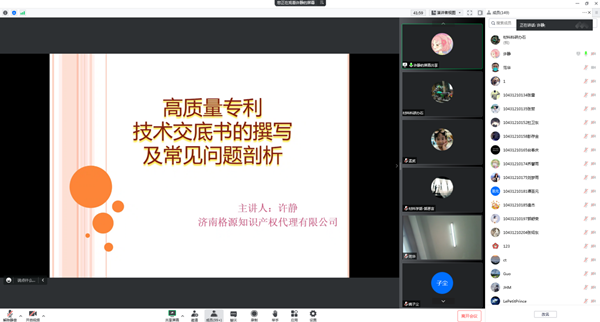 8月25日下午,科技合作与成果转化处举行了“校(院)质量专利撰写及专利导航实务专题培训”线上会议。知识产权工作人员和校(院)师生近150人参加了培训。