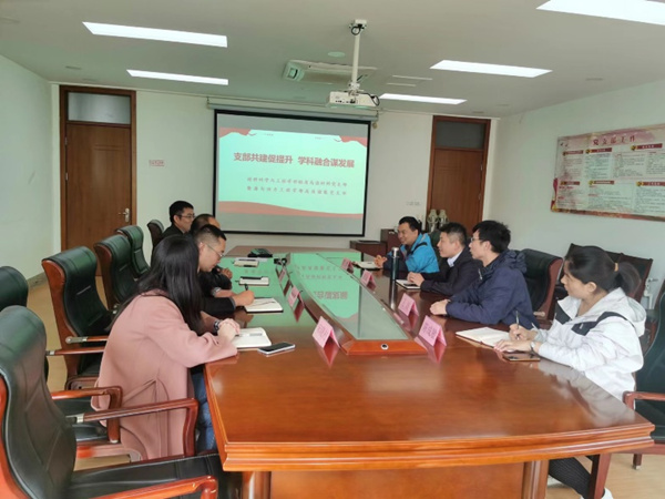 材料科学与工程学部常务副主任周吉学、能源与动力工程学部副主任程屾、双方党员代表参加仪式。周吉学副主任介绍了材料科学与工程学部基层党建、团队建设、学生培养等情况。程屾介绍了能源与动力工程学部基层党建、科教融合学院本科招生、高层次专家引进合作等情况。随后,双方围绕镁离子电池、高效储能、材料表面处理等领域以及人才交流、技术交流、项目合作等方面,进行了深入的交流与探讨。双方希望通过党建共建,推动实现“支部共建促提升、学科融合促发展”。
