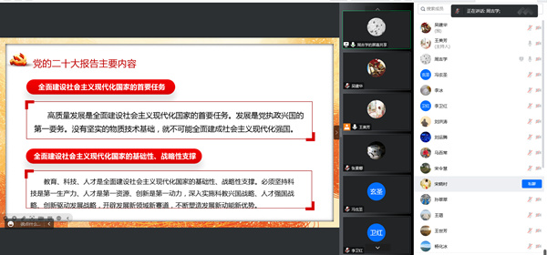 习近平总书记所作的党的二十大报告,为全面建设社会主义现代化国家指明了前进方向、确立了行动指南,是一个凝聚全党智慧、反映人民意愿、对党和国家事业发展具有重大指导作用的纲领性文献。报告首次将“实施科教兴国战略,强化现代化建设人才支撑”作为一个单独部分,充分体现了教育的基础性、战略性地位和作用,并对“加快建设教育强国、科技强国、人才强国”作出全面而系统的部署,为到2035年建成教育强国指明了新的前进方向。周吉学指出,作为科学教育人,我们要始终坚持社会主义办学方向,全面落实立德树人根本任务,立足本职,实干笃行,在紧扣时代脉搏中开拓进取。