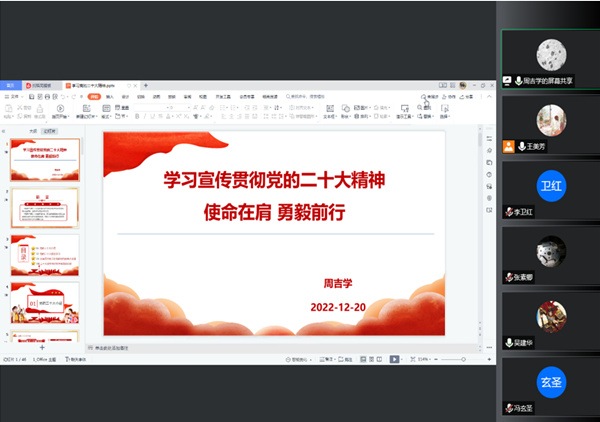 12月20日,为深入学习贯彻党的二十大精神,按照学部宣讲工作的通知要求,轻质高强材料党支部及创新团队全体科研人员通过线上会议集中学习了党的二十大精神。材料学部党委委员、团队主任周吉学同志以“学习宣传贯彻党的二十大精神,使命在肩勇毅前行”为题,从党的二十大报告主要内容、过去五年的工作和新时代十年的伟大变革、二十大报告中对科学教育的论述等四个方面,为大家上了一场主题鲜明、内容详实的专题党课。