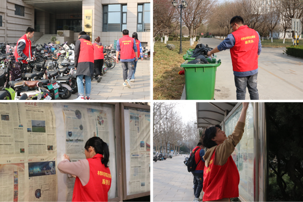 3月4日青年志愿者在长清校区图书馆、宿舍楼和公教楼前开展校园环境提升志愿服务活动。大家兵分三路、分工有序,充分发扬不怕脏、不怕累的精神,一队志愿者将图书馆前杂乱无章的非机动车辆排列整齐,引导过往的同学将车辆有序停放,让秩序井然成为图书馆前亮丽的风景;一队志愿者则前往宿舍楼下,清扫捡拾道路、花坛和草丛内的垃圾,让宿舍楼下的花草树木在春日焕发生机与活力;一队志愿者来到宣传栏前,用抹布擦亮橱窗,让知识与精神在窗明几净中熠熠生辉。